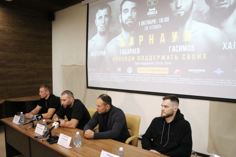 На вопросы алтайских журналистов в конференц-зале «Сибирской медиагруппы» 26 сентября ответили профессиональный боец ММА, выступающий в лиге Bellator, тренер команды Team STRELA Barnaul Шараф Давлатмуродов, руководитель Алтайской краевой федерации панкратиона и грепплинга Александр Нехорошев, а также участники предстоящих боёв Данила Приказа и Николай Нестеров.