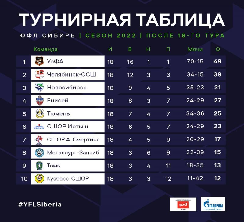 «Челябинск-ОСШ» одолел на своём стадионе «Тюмень». Под занавес первого тайма челябинцы смогли выйти вперёд, голом отметился Даниил Букреев. Во второй половине в составе красно-белых отличился Артём Ахмедьянов. Серебряные призёры ЮФЛ Сибирь из Челябинска завершают сезон на мажорной ноте и по праву находятся на самых высоких позициях. Тюменцы занимают пятую строчку с 25-ю очками в своём активе.