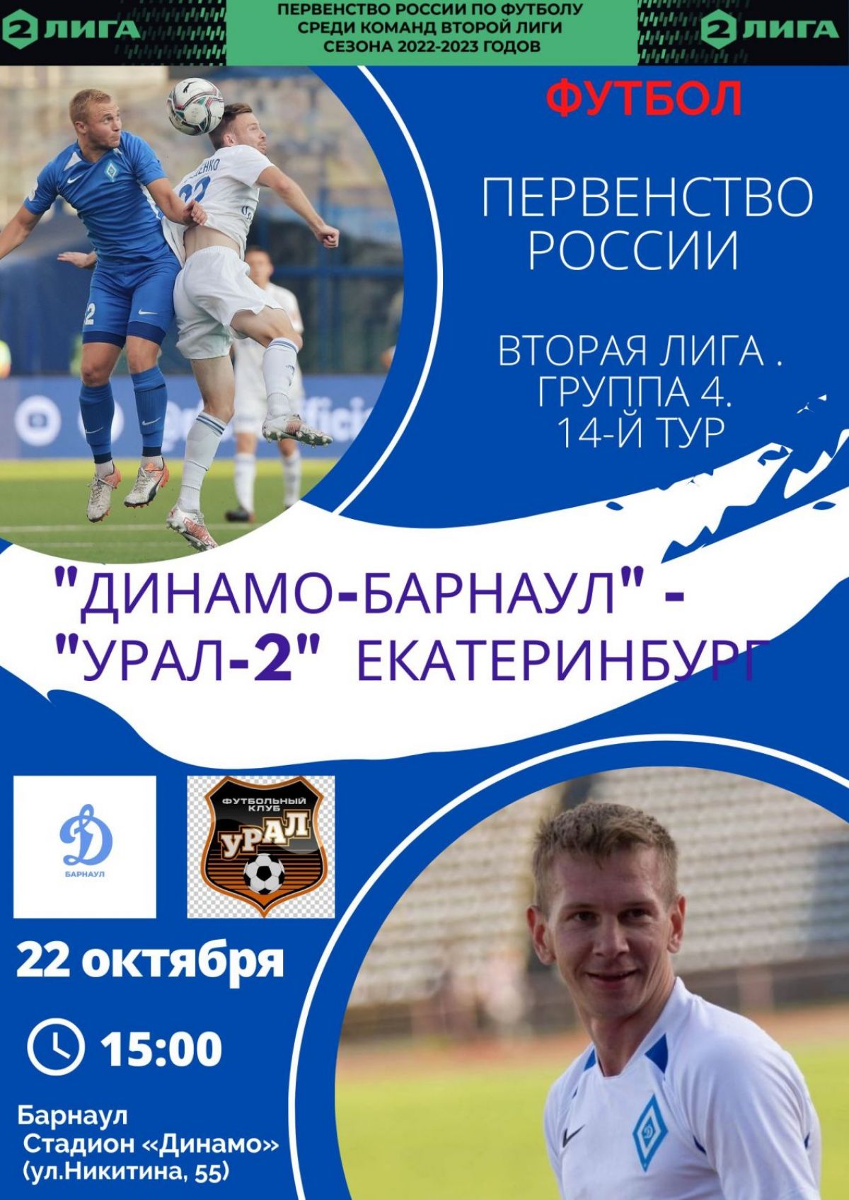 В субботу, 22 октября, футболисты барнаульского «Динамо» проведут заключительный домашний матч осенней части сезона в первенстве России в Группе 4 Второй лиги.