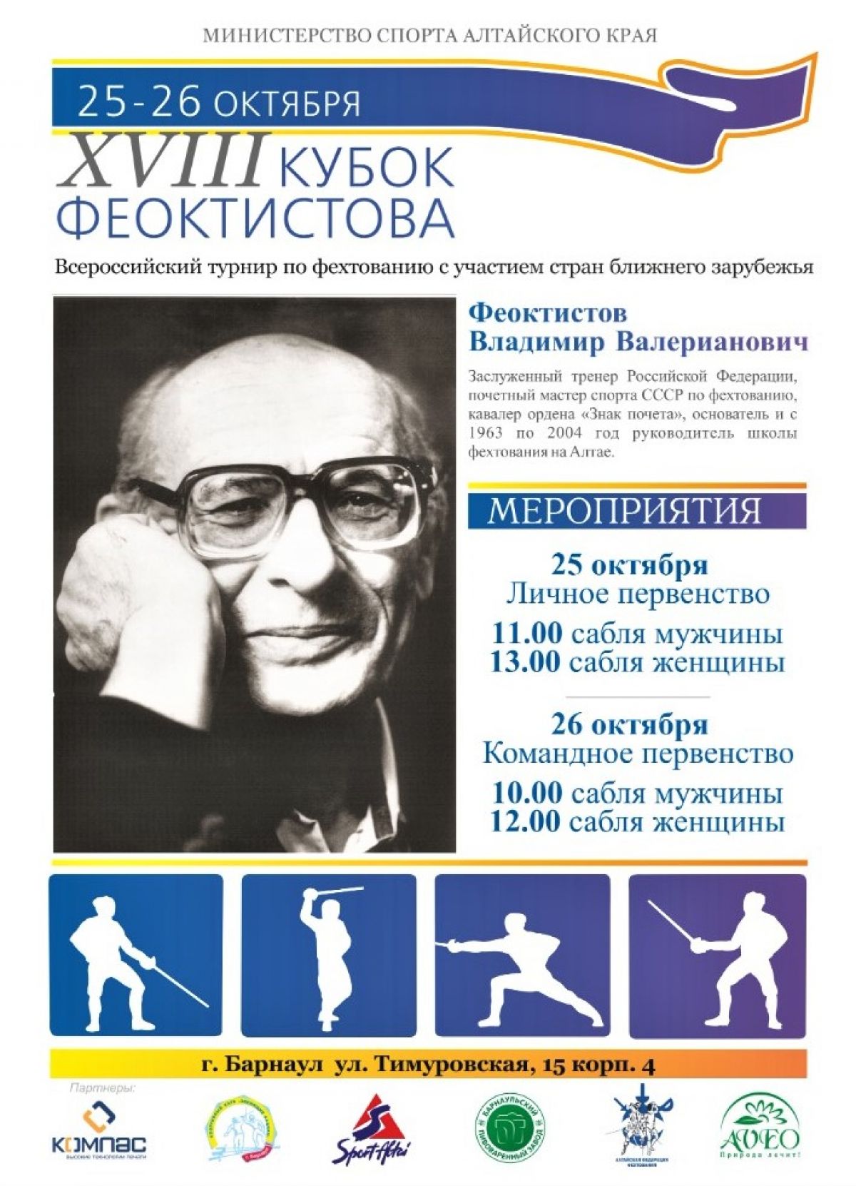 Владимир Валерианович ФЕОКТИСТОВ (1937 - 2004) - заслуженный тренер России, основоположник фехтования в Алтайском крае. Начало развитию мушкетерского искусства на Алтае положила тренировка, которую Владимир Феоктистов провёл в фойе 4-го этажа главного корпуса Алтайского политехнического института (теперь АлтГГУ) для своих первых учеников 17 ноября 1963 года. Это случилось всего через десять дней после того, как выпускник Смоленского института физкультуры трудоустроился в новом для себя городе. А через шесть лет, когда фехтование уже пустило свои корешки в местную почву, в Барнауле благодаря его усилиям состоялся первый на Алтае крупный турнир по фехтованию «Сабля Мамонтова», который со временем стал всесоюзным. С 2005 года эти соревнования получили новое название - «Кубок Владимира Феоктистова». В память об Учителе.