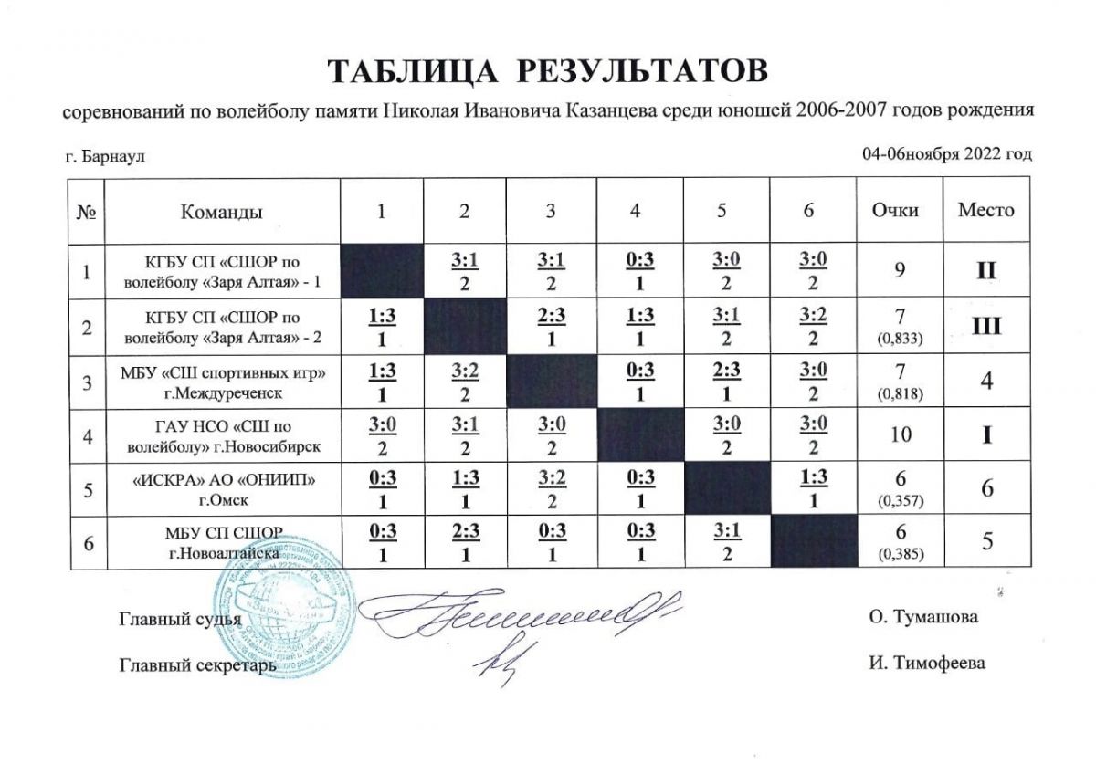 Первое место, пройдя турнир без поражений, заняла команда из Новосибирска, второе и третье место остались за хозяевами соревнований СШОР «Заря Алтая"-1 и «Заря Алтая"-2.