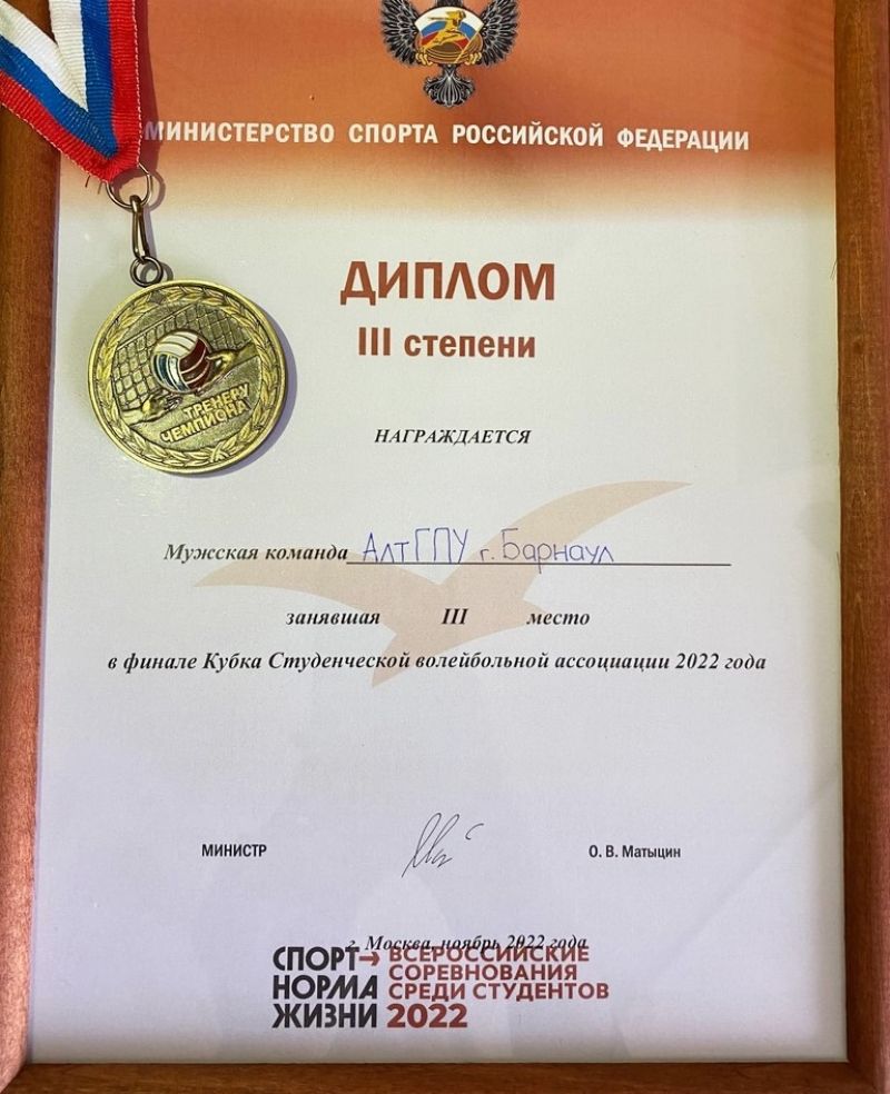 Мужская команда АлтГПУ - бронзовый призёр Кубка Студенческой волейбольной ассоциации
