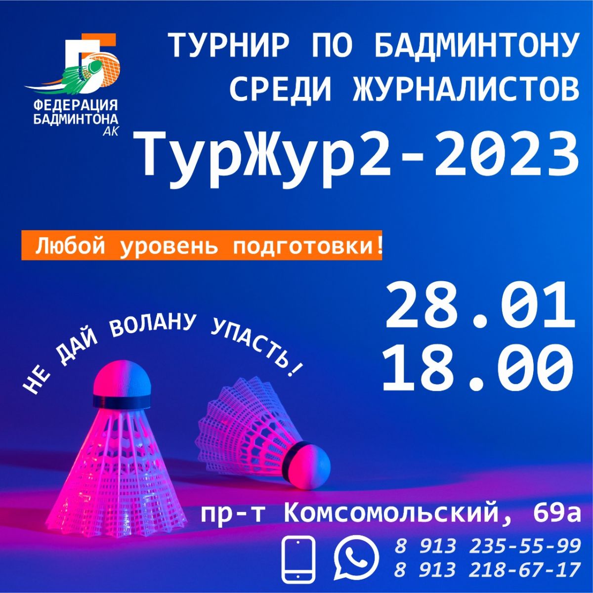 Турнир по бадминтону «ТурЖур-2023» уже можно назвать традиционным: во второй раз Федерация бадминтона Алтайского края организовывает турнир среди журналистов. Он состоится в субботу, 28 января, в манеже «политеха» (пр. Комсомольский, 69-а).