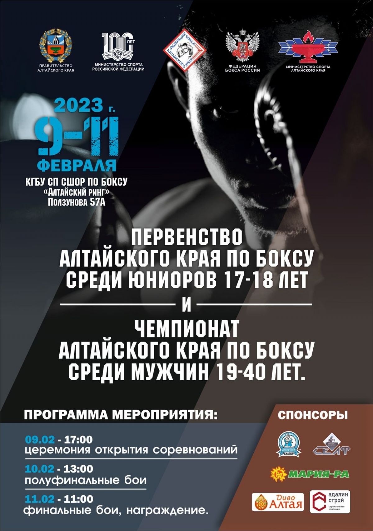 С 9 по 11 февраля в Барнауле пройдет первенство Алтайского края по боксу среди юниоров 17−18 лет (2005−2006 года рождения) и чемпионат Алтайского края по боксу среди мужчин 19−40 лет (1983−2004).