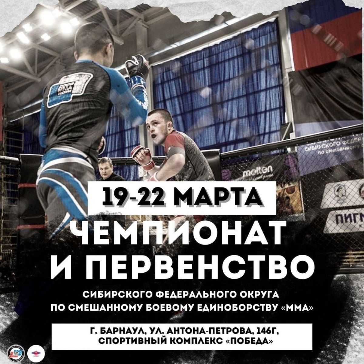 С 20 по 22 марта в барнаульском спорткомплексе «Победа» будут установлены октагоны, в которых в рамках чемпионата (мужчины 18 лет и старше) и первенства (участвуют спортсмены в возрасте 12−13/14−15/16−17 лет и юниоры 2003−2005 годов рождения) Сибири за медали поспорят более 500 сильнейших спортсменов округа.