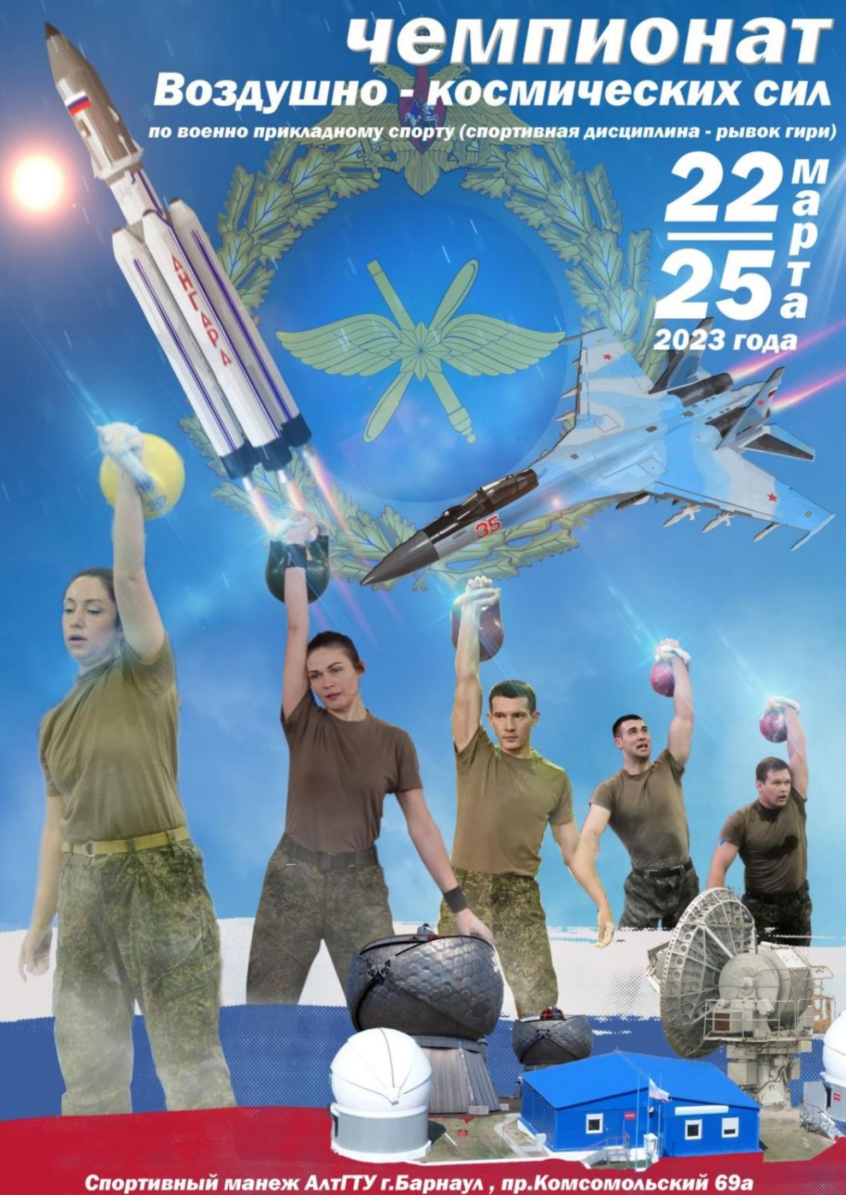 С 23 по 25 марта в Барнауле на базе спортивного манежа Алтайского государственного технического университета имени И.И. Ползунова состоится чемпионат Воздушно-космических сил по военно-прикладному спорту (спортивная дисциплина - рывок гири).