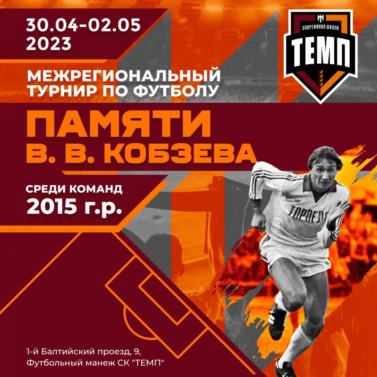 В манеже спортивного клуба «Темп» 30 апреля - 2 мая пройдёт межрегиональный футбольный турнир памяти Владимира Кобзева среди команд, составленных из игроков 2015 года рождения.