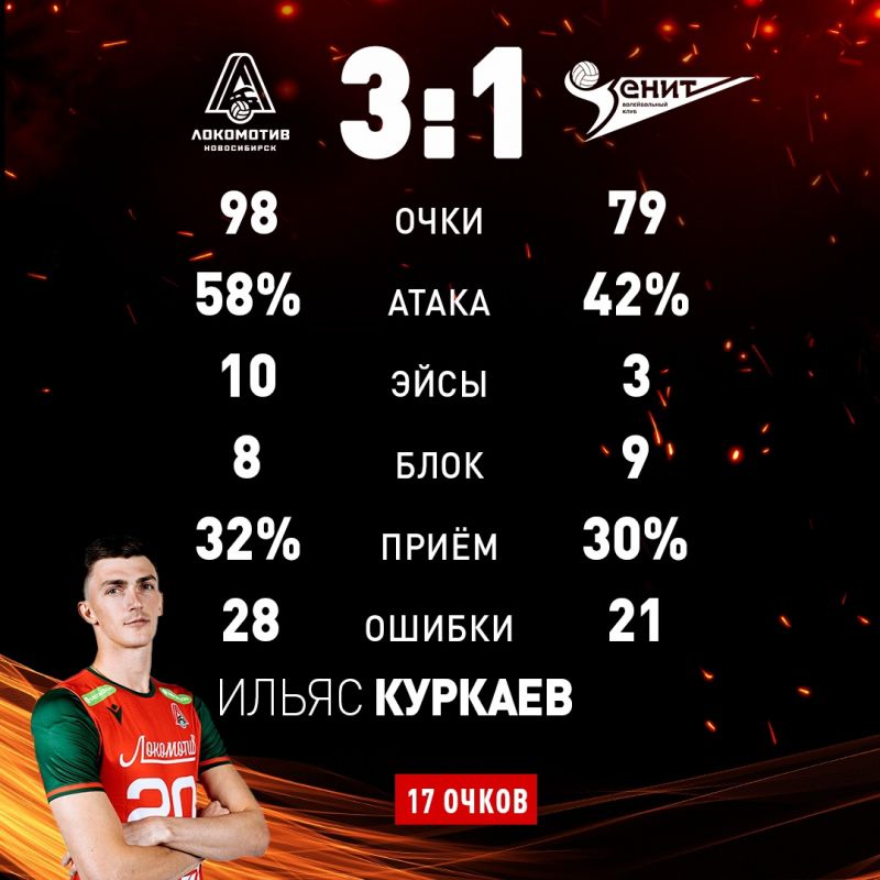 В этот же день в Новосибирске местный «Локомотив» поставил победную точку в финальной серии за бронзу, обыграв «Зенит» из Санкт-Петербурга - 3:1 (25:19, 23:25, 25:22, 25:13). Выходец из Бийска, воспитанник СШОР «Заря Алтая» Ильяс Куркаев стал в этом поединке самым результативным игроком новосибирской команды, заработав для неё 17 очков. «Локомотив» победил в серии со счётом 3:1.