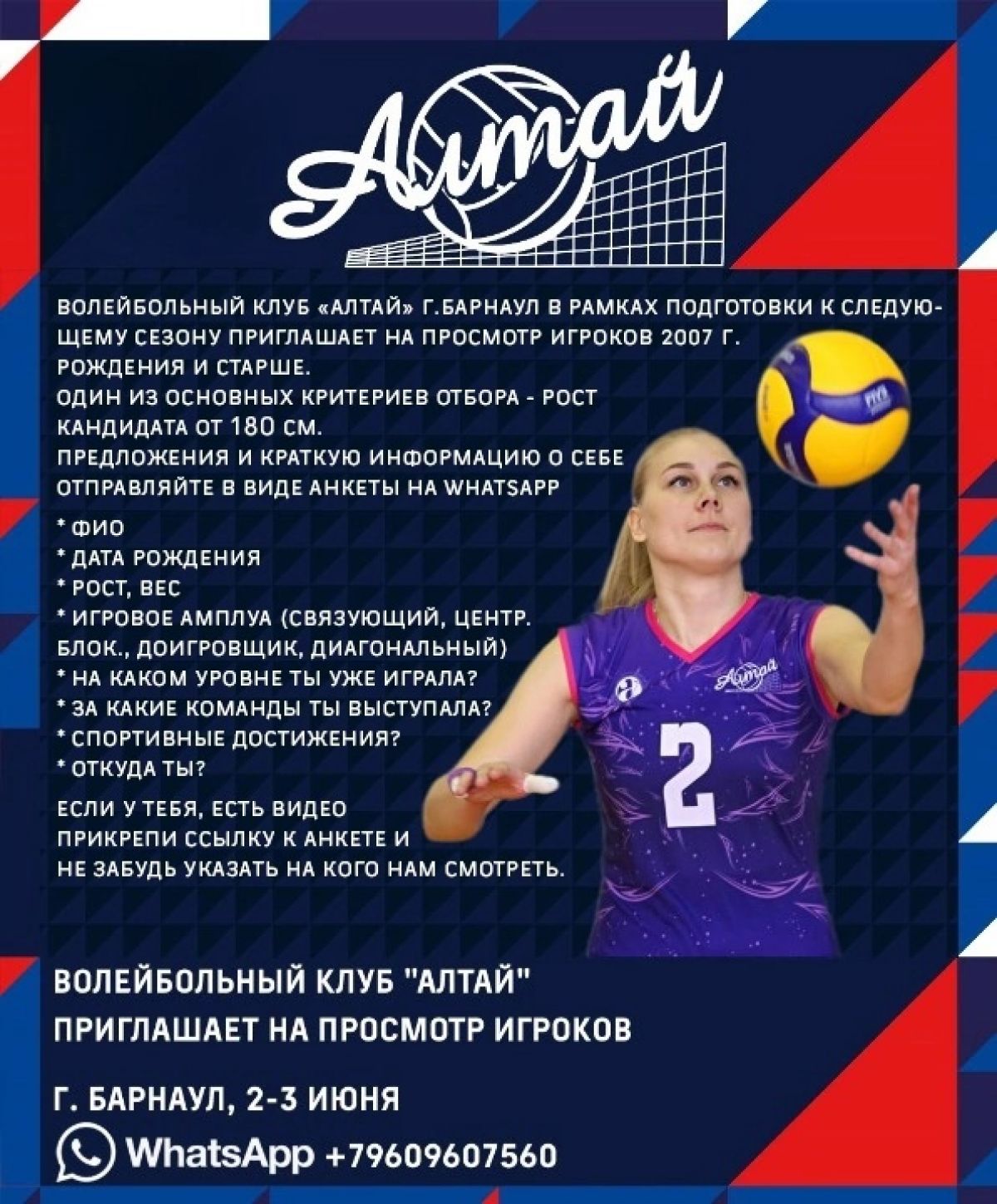 Волейбольный клуб «Алтай-АГАУ» в рамках подготовки к следующему сезону приглашает игроков 2007 года рождения и старше пройти просмотр в главную команду края.