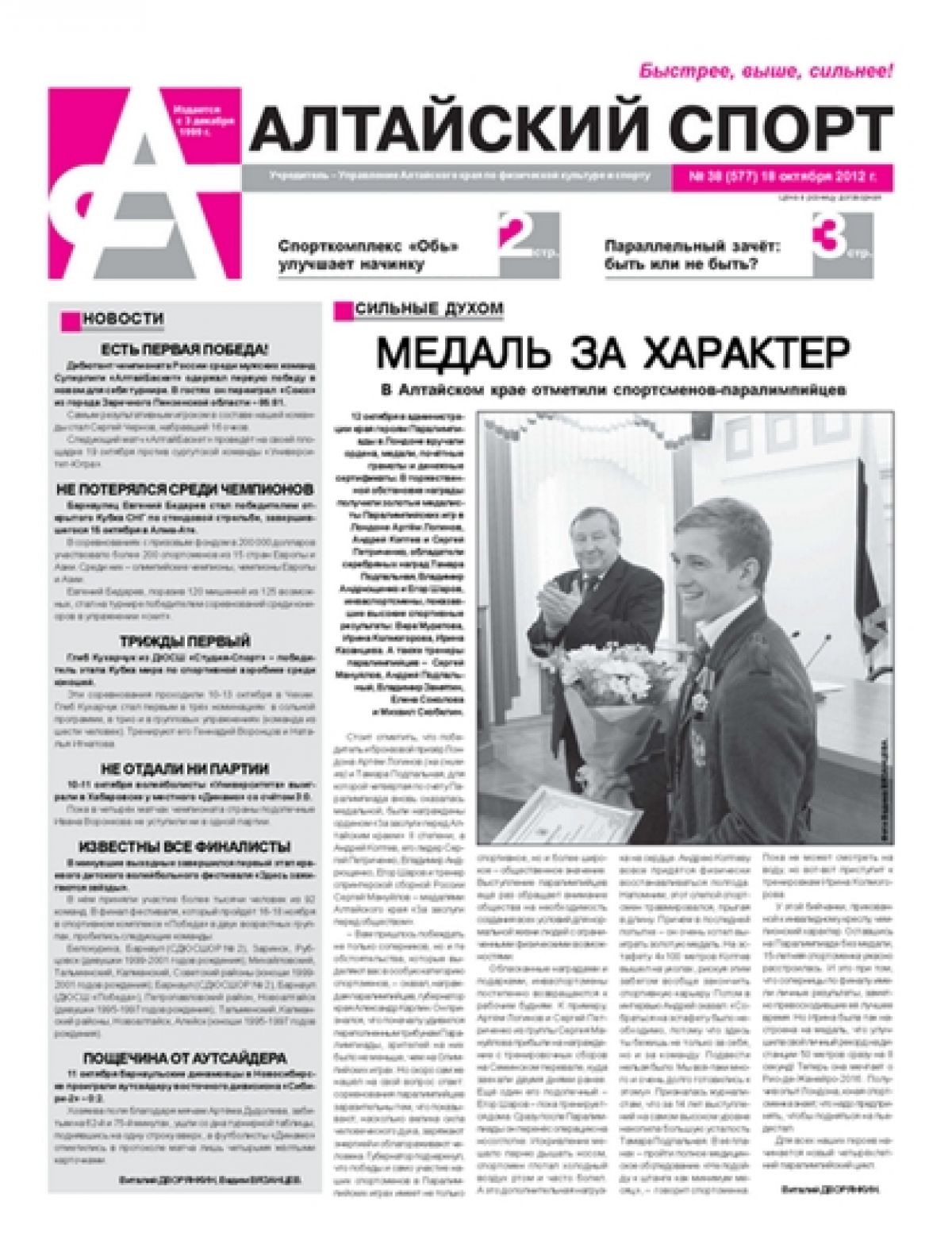 - Медаль за характер. В Алтайском крае отметили спортсменов-паралимпийцев.
