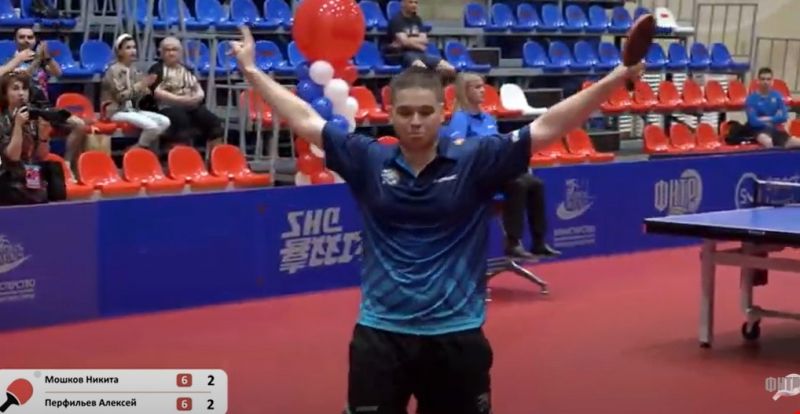 Соперник Алексея явно не был готов, что этакая «зелень» задаст ему трепку. Только при счёте 1:7 Мошков, наконец, пришёл в первой партии в себя и начал методично отыгрываться. Но Алексея уже было не унять, он успел поймать кураж - играл смело и раскованно. Первую партию выиграл 11:9, а вторую - 11:7. Никита Мошков всё-таки сумел отыграться, дважды взяв верх с одинаковым счётом 11:7. Но в укороченной пятой партии до семи очков опытный теннисист при счёте 6:6 неожиданно дрогнул, и Алексей Перфильев одержал сенсационную победу.