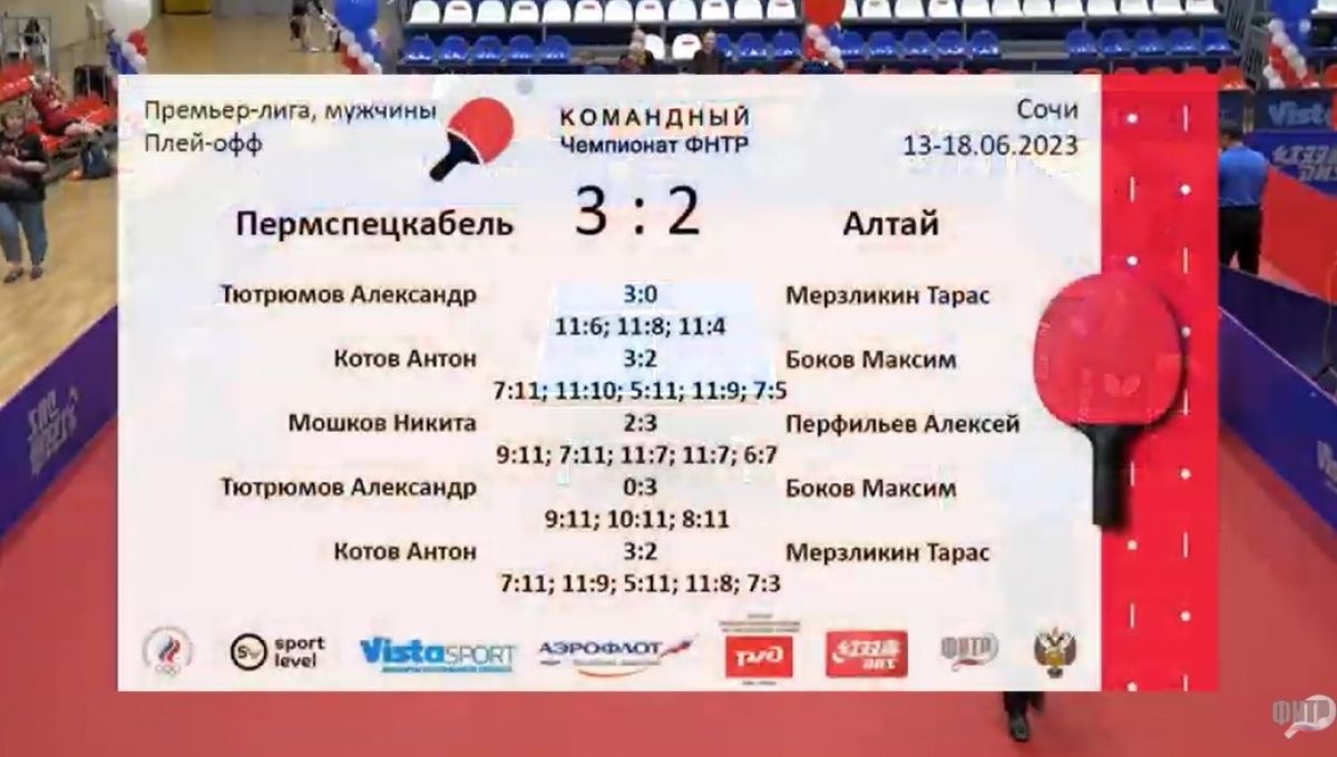 В Сочи проходит плей-офф командного чемпионата Федерации настольного тенниса России среди мужских и женских команд Премьер-лиги. Мужской «Алтай», занявший в регулярном чемпионате восьмое место, 14 июня в 1/8 финала плей-офф встречался с пятой командой регулярки - «Пермспецкабелем» из Пермского края. Эту схватку стоило увидеть.
