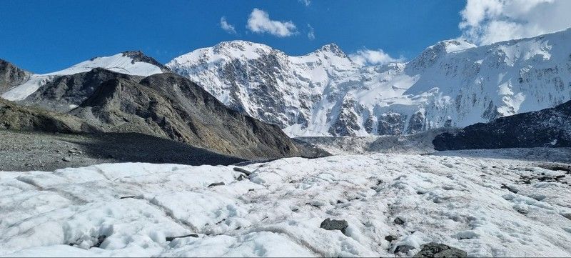 Затем участники похода зашли на Ак-Кемский ледник (подножье г. Белуха) и завершили туристический поход в базовом лагере на живописном озере Ак-Кем («Ак-Кем» в переводе с южно-алтайского означает «белая вода» - такой цвет ей придают взвеси минералов, которые приносит с ледника одноименная река, хотя на самом деле цвет у озера всегда разный: то ярко-бирюзовый, то серо-белый - в зависимости от погоды, температура воды в озере не превышает +4,5 градусов).