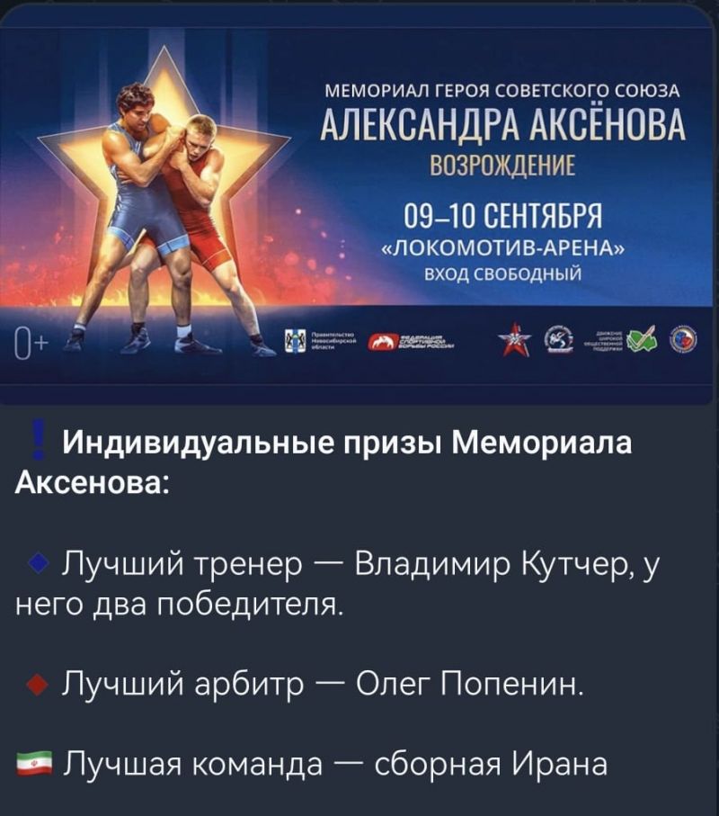 В Новосибирске 9−10 сентября состоялся традиционный Мемориал Героя Советского Союза Александра Аксёнова «Возрождение». Международные соревнования, собравшие борцов из Армении, Беларуси, Ирана, Казахстана, Кыргызстана, Таджикистана, Узбекистана и 29 регионов России проходили в одном из крупнейших спортивных центрах города «Локомотив Арене». Среди участников турнира был 1 заслуженный мастер спорта и 12 мастеров спорта международного класса.