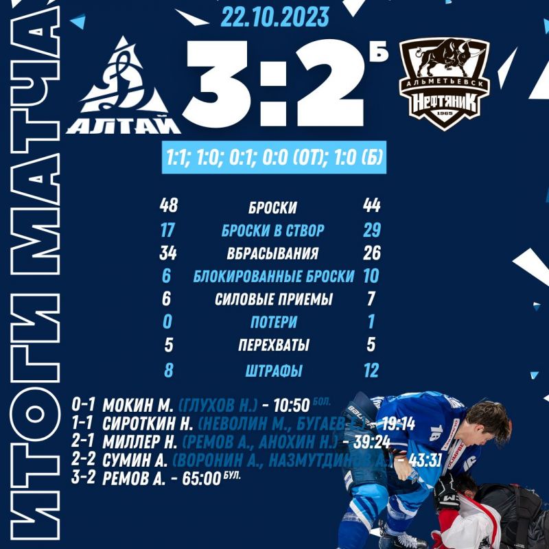 «Динамо-Алтай» (Барнаул) - «Нефтяник» (Альметьевск) - 3:2 Б (1:1; 1:0; 0:1; 0:0; - 1:0).