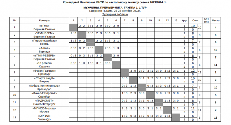 27 октября в Оренбурге и Верхней Пышме состоялись матчи первого тура мужского турнира Командного чемпионата Федерации настольного тенниса России (ФНТР).