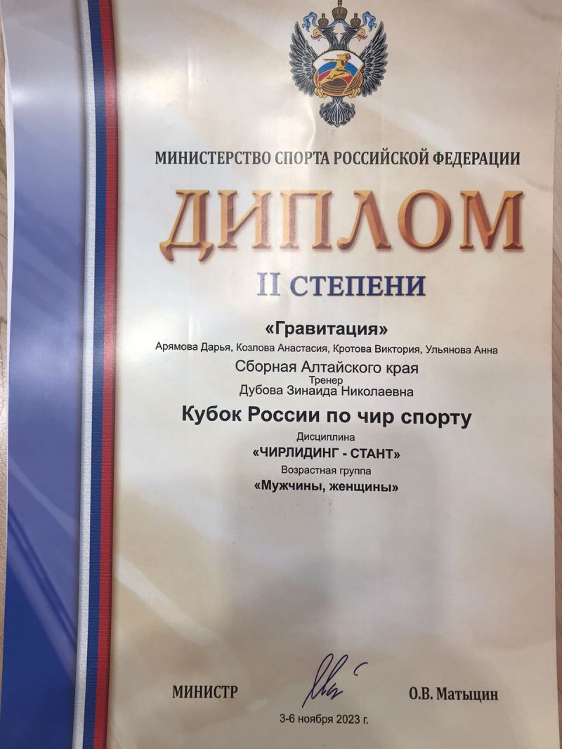 Второе место среди женщин в дисциплине «Чирлидинг - стант» занял в Кубке России квартет из Барнаула «Гравитация» - Дарья Арямова, Анастасия Козлова, Виктория Кротова, Анна Ульянова.