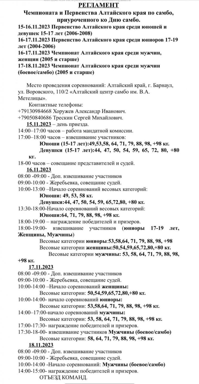 С 16 по 18 ноября в «Алтайском центре самбо» имени Валерия Метелицы в Барнауле (ул. Воровского, 110/2) пройдут чемпионат и первенство Алтайского края по самбо и боевому самбо.