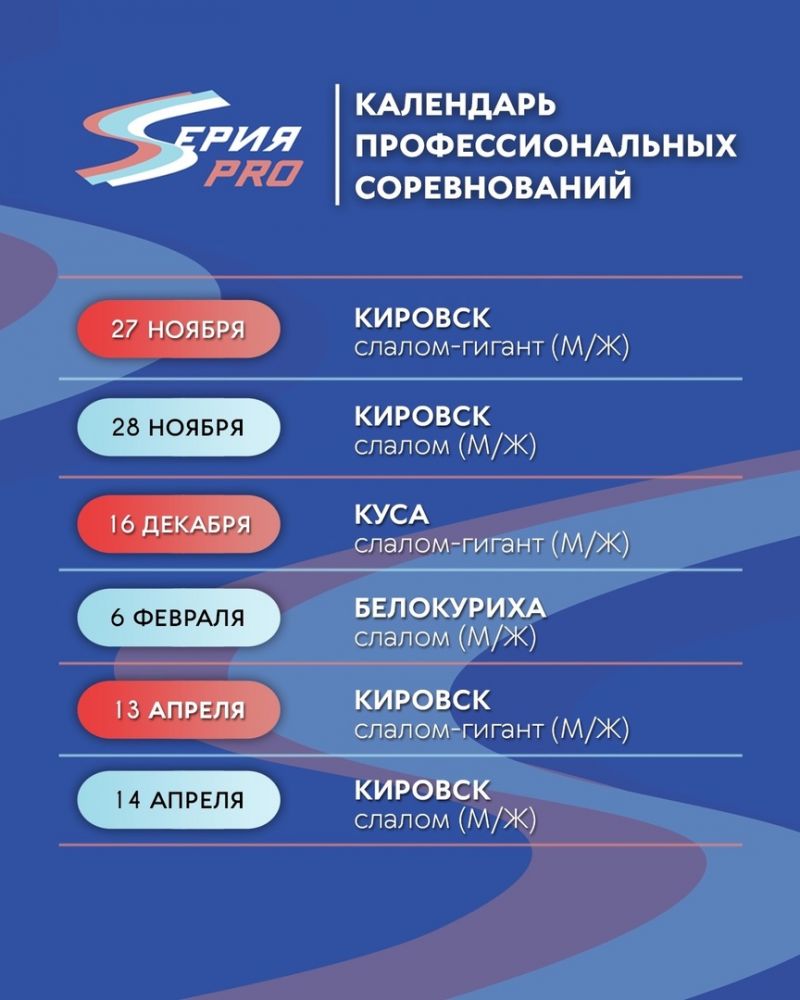В первом сезоне «Серия PRO» будет состоять из четырёх этапов: три первые состоятся в Кировске (Мурманская область), Кусе (Челябинская область) и Белокурихе (Алтайский край) в преддверии этапов Кубка России, а четвёртый - в Кировске после финала Кубка России в слаломе.