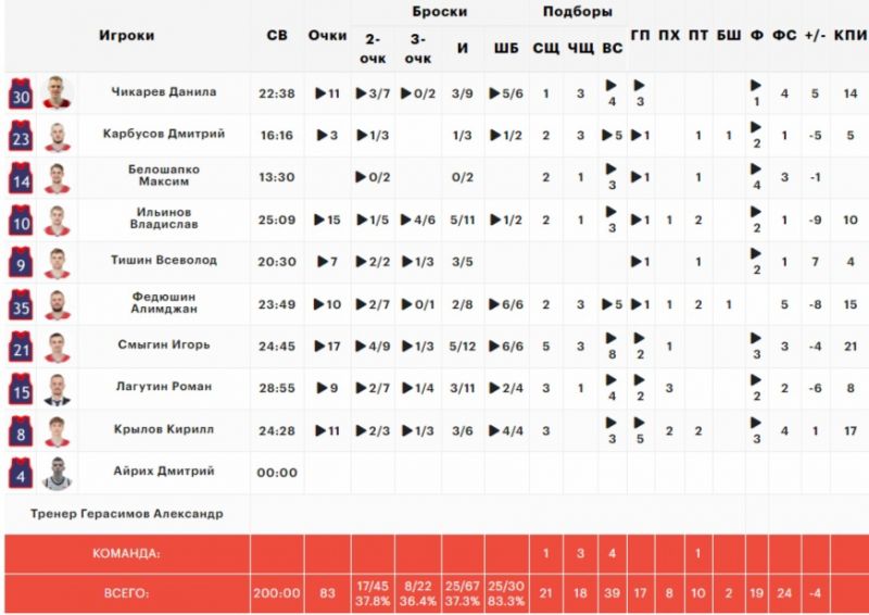 Самыми результативными игроками в составе БК «Барнаул» стали Игорь Смыгин (17 очков + 8 подборов), Владислав Ильинов (15 очков + 3 подбора) и Кирилл Крылов (11 очков + 3 подбора + 5 передач + 2 перехвата).