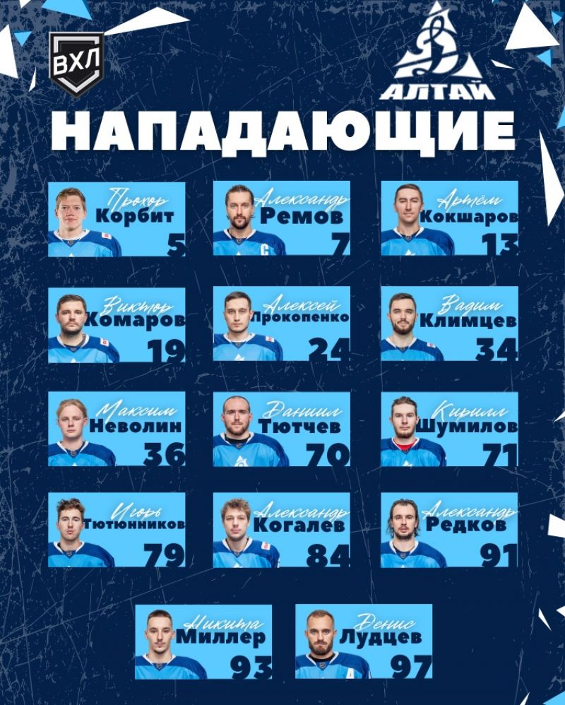 нападающие: Прохор Корбит, Александр Ремов (К), Артем Кокшаров, Виктор Комаров, Алексей Прокопенко, Вадим Климцев, Максим Неволин, Даниил Тютчев, Кирилл Шумилов, Игорь Тютюнников, Александр Когалев, Александр Редков, Никита Миллер, Денис Лудцев (А).