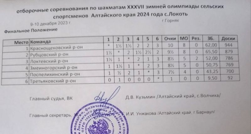 Вслед за отборочным турниром в Ключах, где путёвки в финал XXXVII краевой зимней олимпиады сельских спортсменов Алтайского края получили шахматисты Благовещенского и Ключевского районов, отборочные шахматные соревнования прошли 9−10 декабря в Локтевском районе.