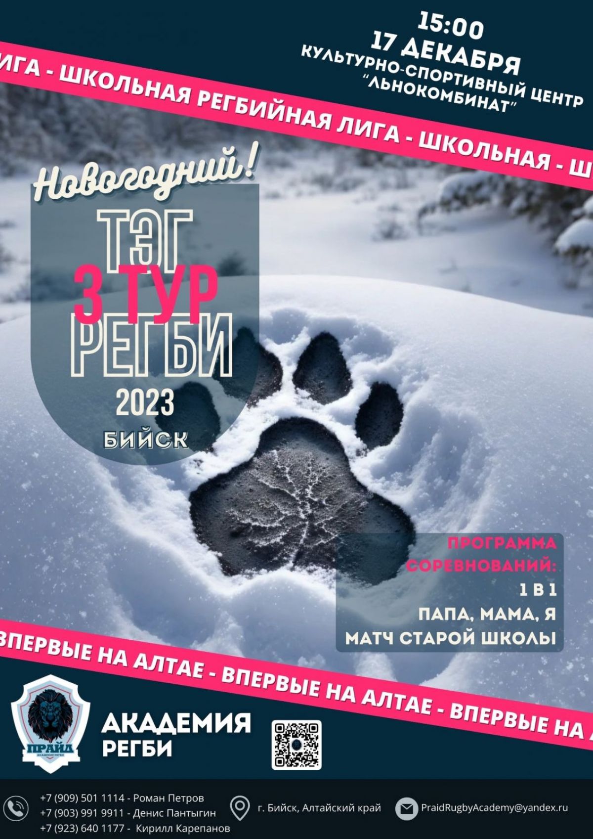 16 декабря. Первомайское. Зал СОШ. 17 декабря. Бийск. КСЦ «Льнокомбинат». Школьная регбийная лига. Дивизионы В и А