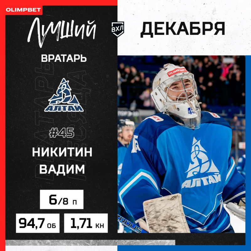 Лучшим вратарем стал голкипер ХК «Динамо-Алтай» Вадим Никитин, который сыграл в последнем месяце прошедшего года в восьми матчах, одержав шесть побед и отразив 94,7% бросков при коэффициенте надежности 1,71. При этом в двух матчах Вадим оставил свои ворота в неприкосновенности!