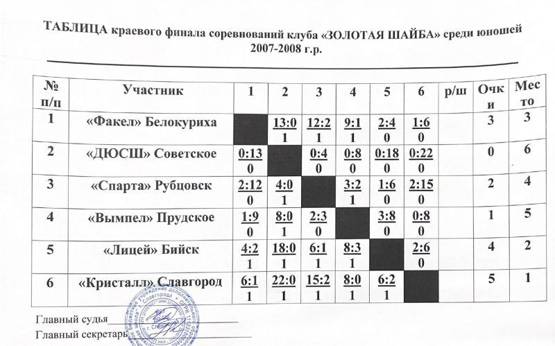 Победителями «Золотой шайбы» стали хоккеисты местного «Кристалла». Команда уверенно выиграла все пять матчей. Второе место занял бийский «Лицей», а замкнула тройку призёров команда из Белокурихи.