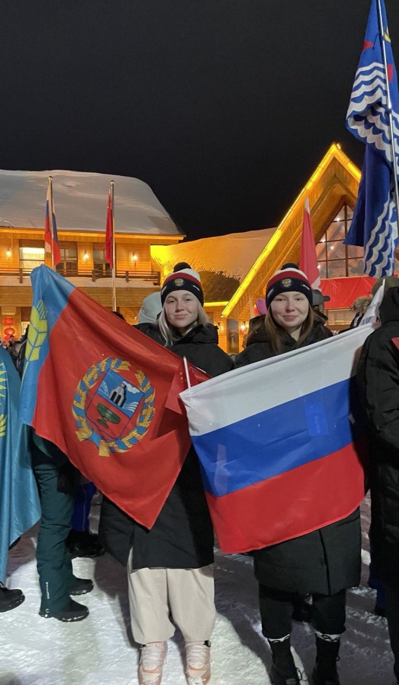 Флаг Российской Федерации на торжественном открытии I зимних игр «Большой Алтай» доверили вынести лыжнице из Алтайского края Веронике Кротовой, которой в этот день исполнилось 18 лет.