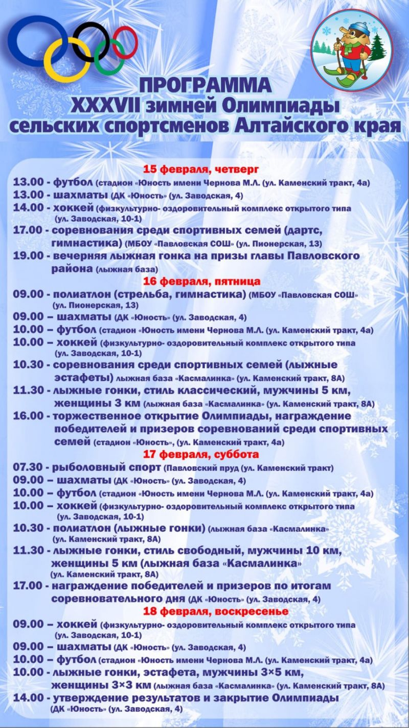 С 15 по 18 февраля райцентр Павловск примет финалы XXXVII зимней олимпиады сельских спортсменов Алтайского края по лыжным гонкам, полиатлону, рыболовному спорту, футболу 8×8, хоккею, шахматам и соревнованиям спортивных семей.