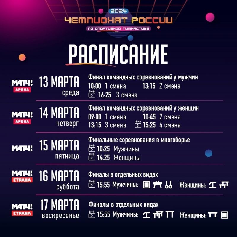Чемпионат России по спортивной гимнастике проходит на федеральной территории «Сириус» в Краснодарском крае 13−17 марта. В соревнованиях участвуют более 150 спортсменов, которые будут соревноваться за 14 комплектов наград.