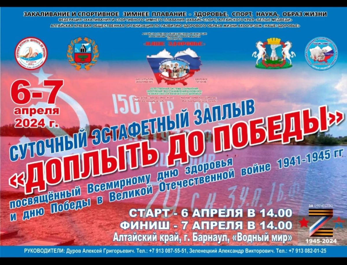Алтайская Федерация закаливания и зимнего спортивного плавания «Белые медведи» приглашает всех желающих на барнаульский пляж «Водный мир» для участия 6−7 апреля в суточном заплыве «Доплыть до Победы», посвящённом Всемирному дню здоровья и победе в Великой Отечественной войне.