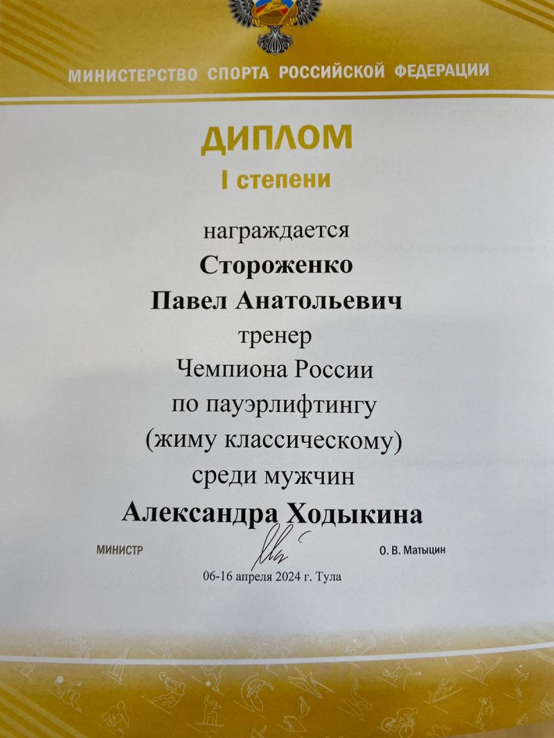 Александр Ходыкин, подопечный тренера Павла Стороженко, выступал в весовой категории 120 кг и пожал лёжа вес 227,5 кг.