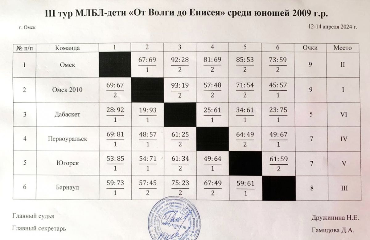 С 12 по 14 апреля в Омске прошёл третий тур детской межрегиональной любительской баскетбольной лиги «От Волги до Енисея» среди команд юношей 2009 года рождения.