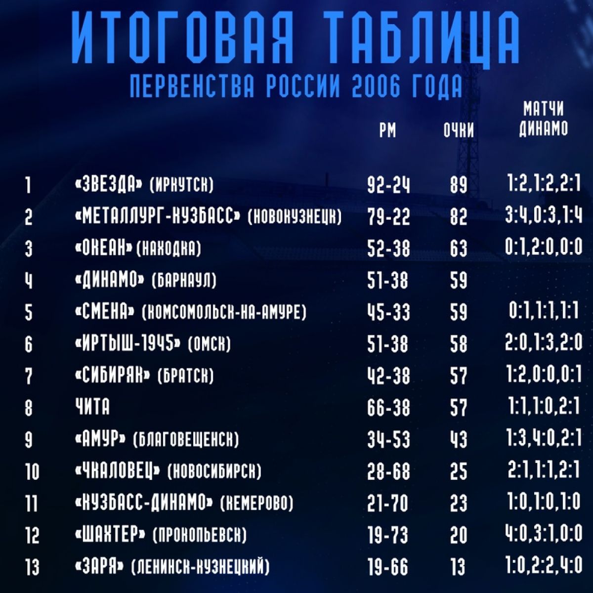 Последние матчи сезона динамовцы проводили со «Звездой» в Барнауле и в Новосибирске - с «Чкаловцем». Правда, к матчу в Барнауле «Звезда» уже выиграла в Омске (3:0) и обеспечила себе чемпионское звание. Вместе со «Звездой» чемпионами стали Дмитрий Байда, Виктор Исайченко и Андрей Силютин, хорошо известные нам по их выступлениям в «Динамо». Два гола Алексея Сорочкина принесли динамовцам победу над чемпионами - 2:1. Теперь нужно было выиграть еще и в Новосибирске. В случае же поражения в этом последнем туре «Динамо» занимало восьмое место.