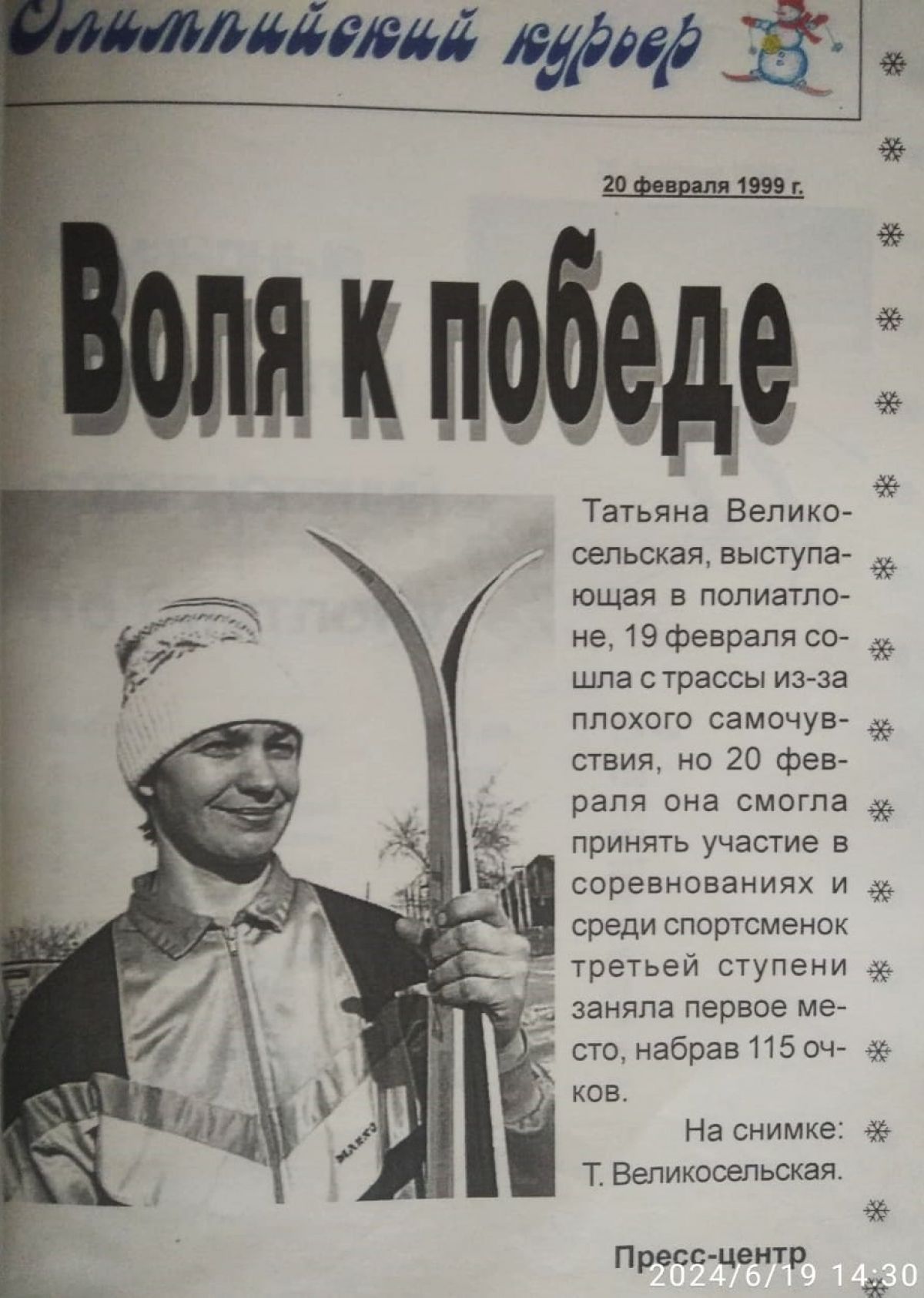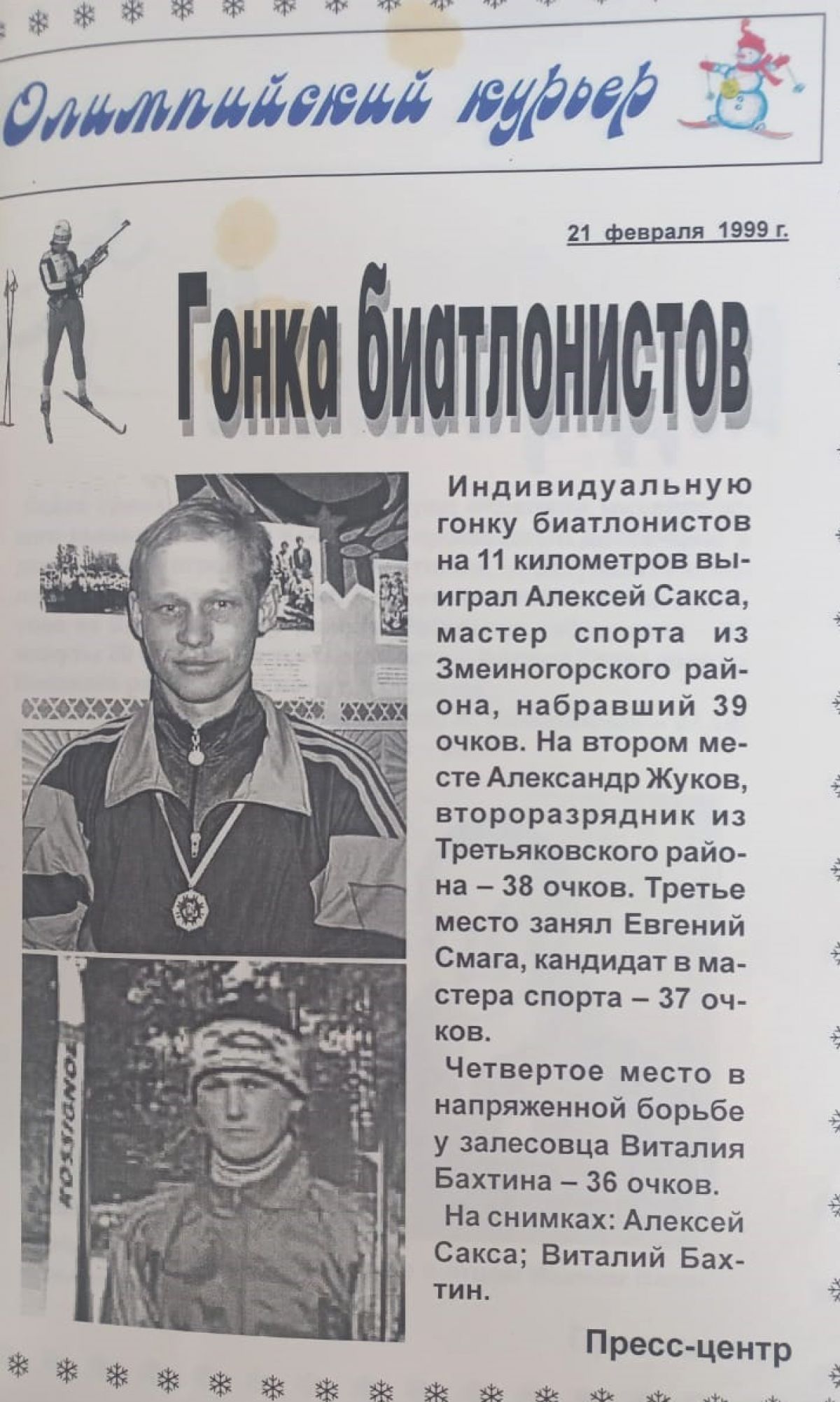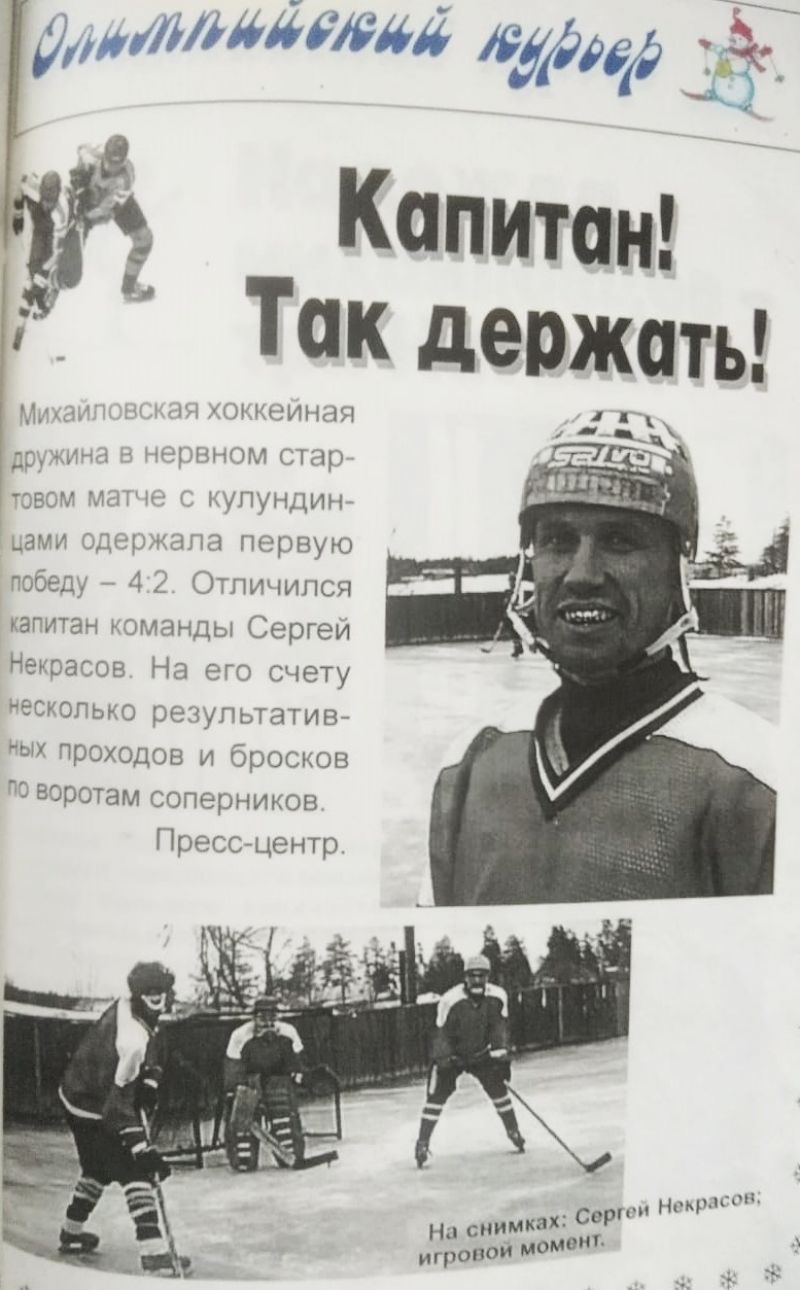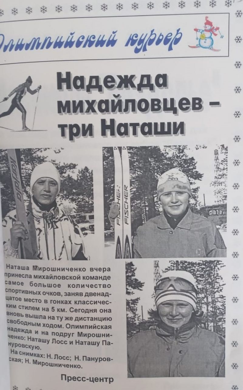 «Снеговик был рад всем». Под таким заголовком вышел репортаж о финале зимней олимпиады сельских спортсменов Алтая в газете «Алтайская правда» от 24 февраля 1999 года. Начинался он с таких слов: «С 18 по 21 февраля село Михайловское принимало XIV зимнюю олимпиаду спортсменов Алтая. Гостеприимство и благородство - вот что вспомнят спортсмены через годы, когда речь зайдет о том, как проходила олимпиада в этом райцентре». Предлагаем полный текст газетного материала.