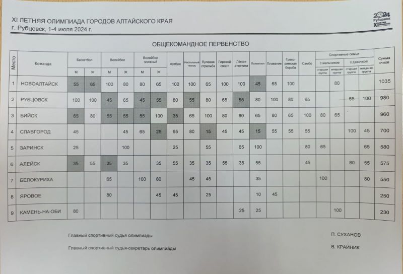 Победителями общекомандного зачёта одиннадцатой летней олимпиады городов Алтайского края стали спортсмены Новоалтайска, на втором месте хозяева турнира рубцовчане, третьими стали спортсмены Бийска.