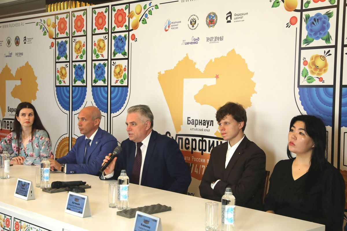 Днем на месте проведения соревнований - в Алтайском краевом театре драмы им. В. М. Шукшина - прошла предстартовая пресс-конференция с участием действующих чемпионов России гроссмейстеров Владислава Артемьева и Баиры Ковановой, исполнительного директора Федерации шахмат России Александра Ткачева и президента Федерации шахмат Алтайского края, директора Суперфиналов Артема Поломошнова.