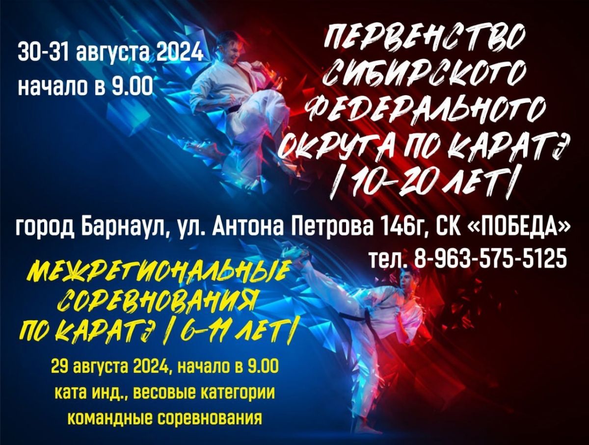 30−31 августа Барнаул примет участников первенства Сибирского федерального округа по каратэ среди юношей и девушек, юниоров и юниорок. Соревнования будут проходить в спортивном комплексе «Победа».