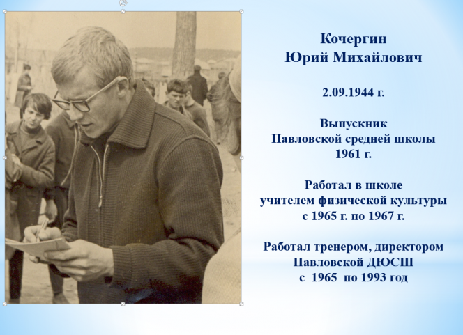 Юрий Михайлович Кочергин возглавлял Павловскую ДЮСШ с 1965 по 1993 годы, а сейчас на заслуженном отдыхе. Вся его жизнь пронизана любовью к спорту и прежде всего, конечно, к лёгкой атлетике - королеве спорта. 2 сентября Юрий Михайлович отметил свой 80-летний юбилей.