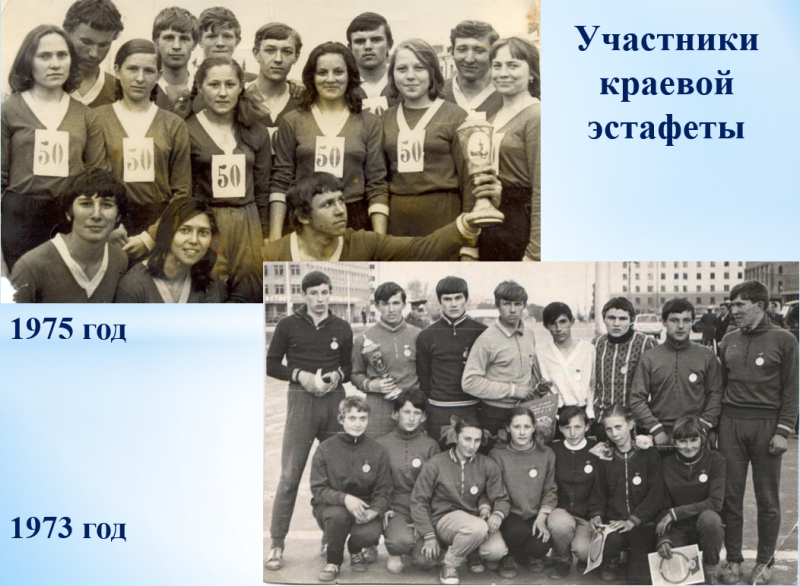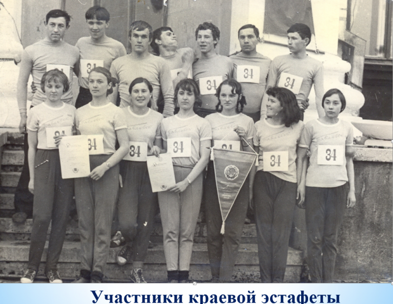 Юрий Мартынов первым преодолел шестиметровый рубеж в прыжках в длину, показав для того времени очень приличный результат - 6.13. Галина Журова и Татьяна Кривошеева прыгали в длину за пять метров. Татьяна установила рекорд края - 5.39 сантиметров. Она и спринт бежала прилично: её лучший результат на стометровке - 12,8 сек. В свою очередь, Галина Кривошеева стала чемпионкой края по прыжкам в высоту (её рекорд - 150 см).