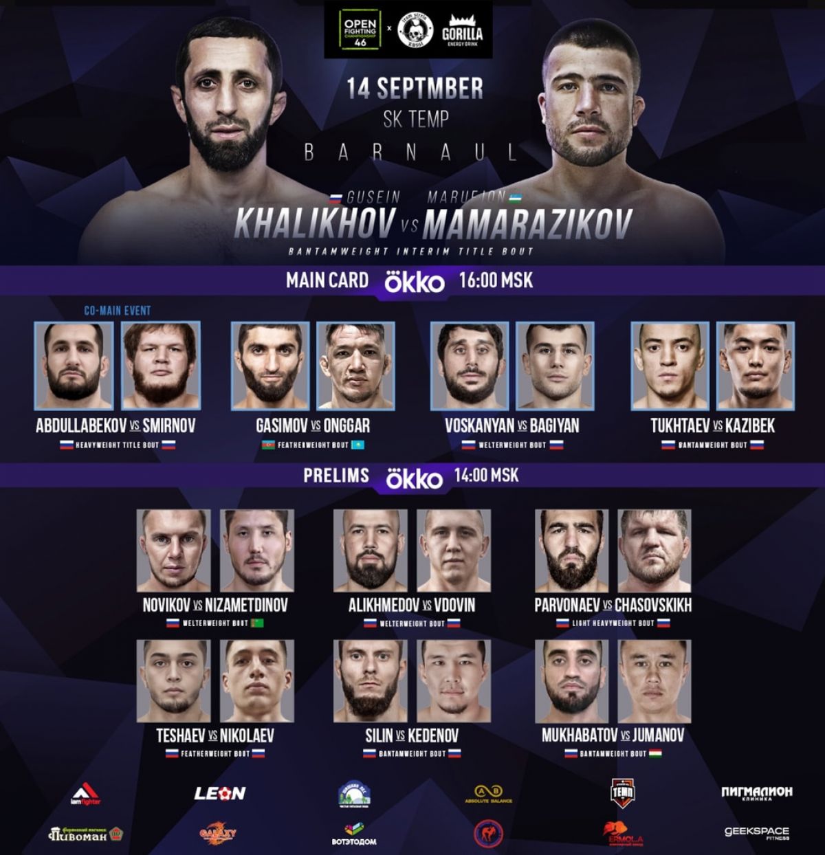 В этом году в титульном поединке выступит ярчайший представитель лиги Гусейн Халиков. 14 сентября Гусейн проведет титульный бой против бойца из Узбекистана Маруфджона Мамаразикова.