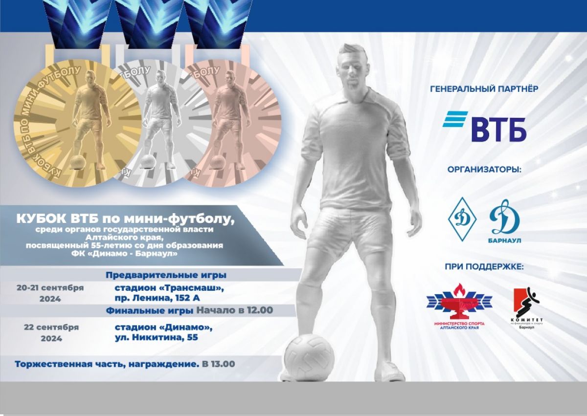 20−22 сентября в Барнауле в четвертый раз состоится мини-футбольный турнир «Кубок ВТБ-2024» среди органов государственной власти Алтайского края, посвященный 55-летию ФК «Динамо-Барнаул».