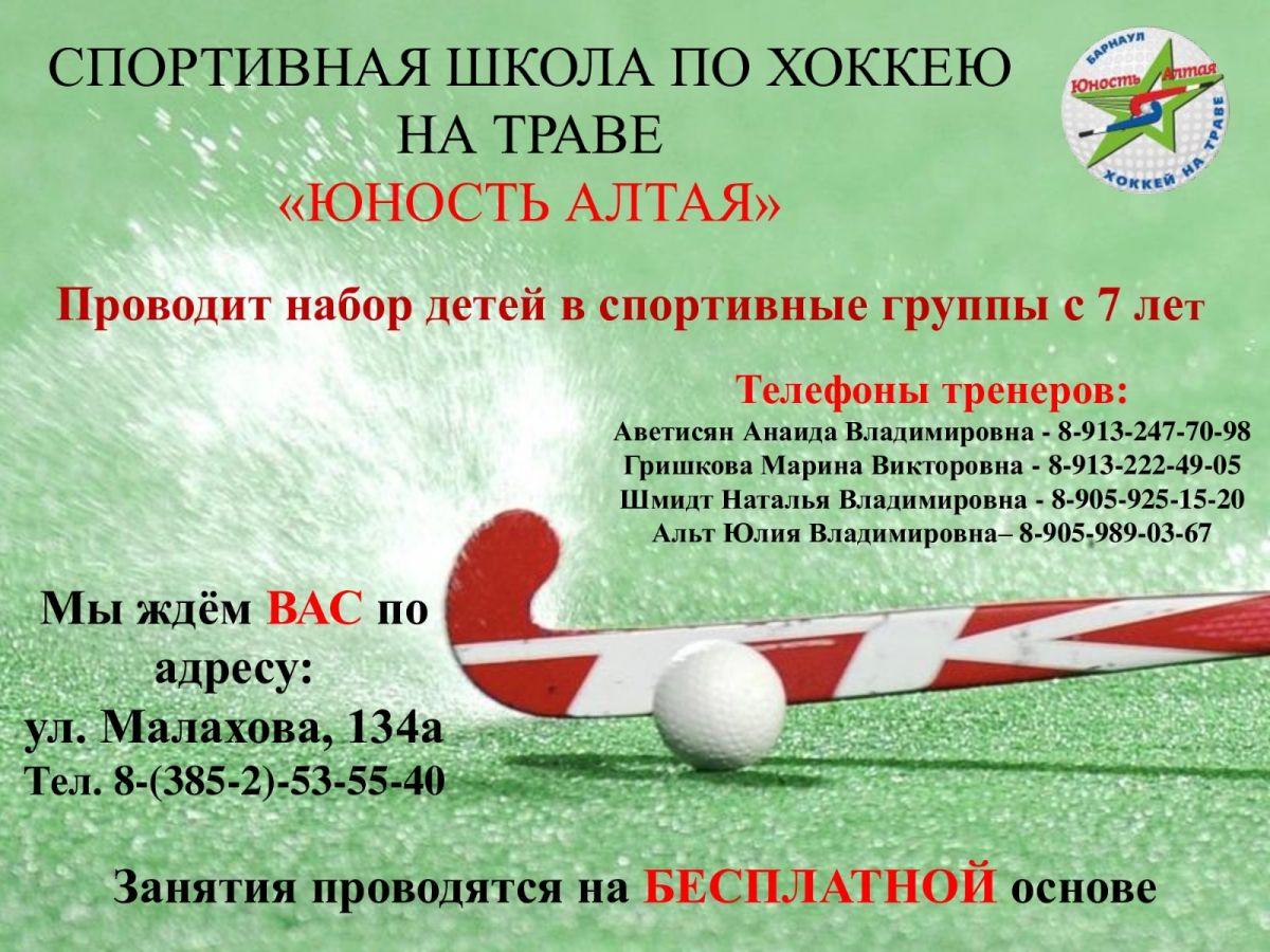 Спортивная школа по хоккею на траве «Юность Алтая» проводит набор детей с 7 лет в спортивные группы.