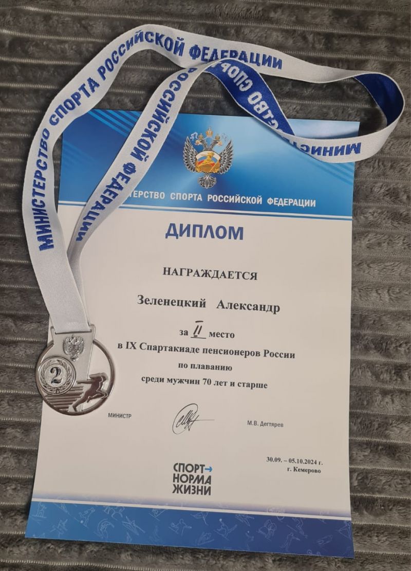 Александр Зеленецкий - серебряная медаль в плавании 50 метров вольным стилем среди спортсменов 70 лет и старше (результат 36,88); бег на 1000 метров среди спортсменов 70 лет и старше (результат - 4.15,9) - 13 место; кроме этого, показал лучший результат в команде на сдаче норм ГТО - занял среди сверстников 11 место.