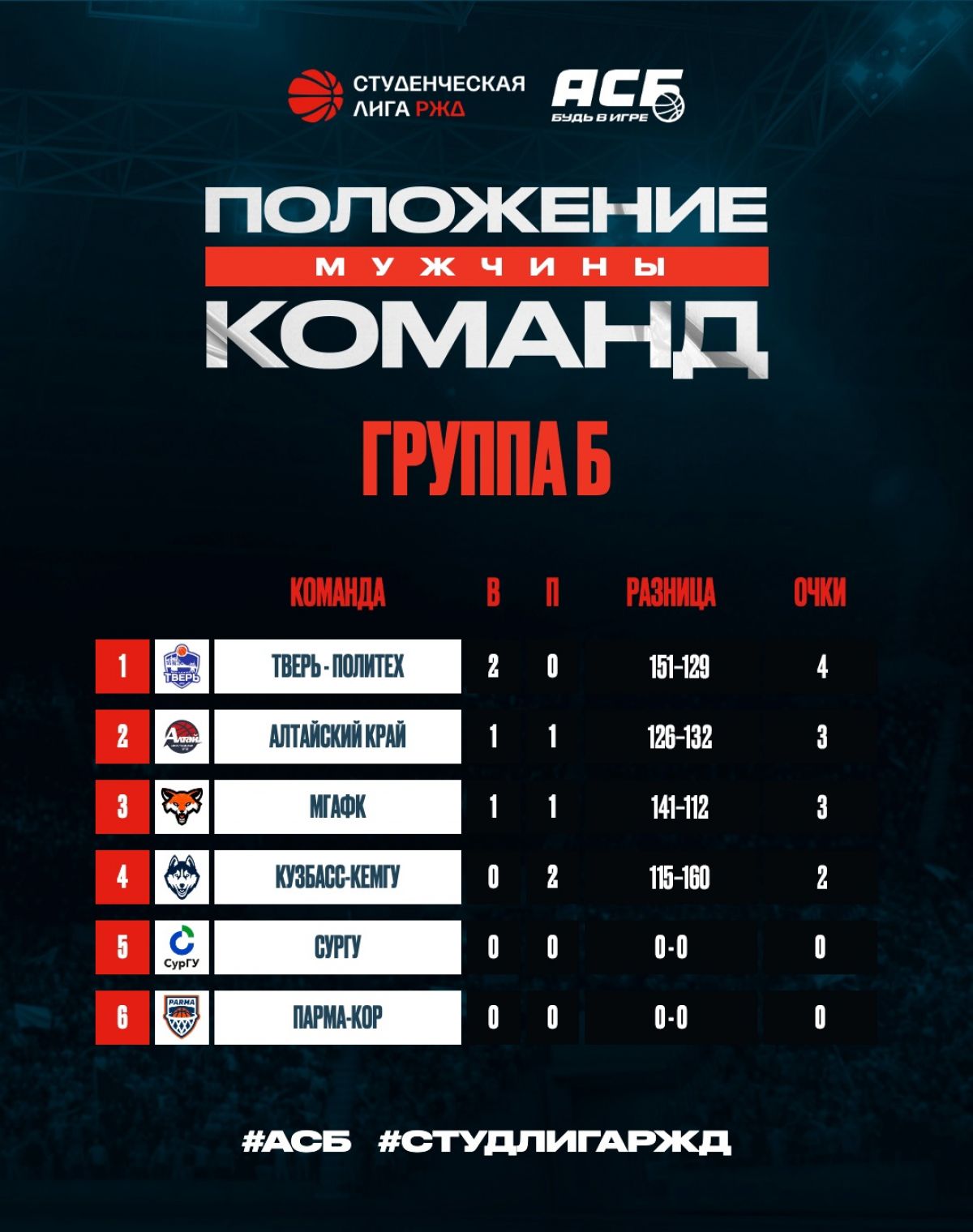 Напомним, Лига РЖД - элитный дивизион Ассоциации студенческого баскетбола. Среди участников - сборная Алтайского края. Всего в первом раунде соревнований играют 25 команд. Коллективы разбиты на четыре группы. Наша команда выступает в группе «Б». В подгруппе шесть команд - «Алтайский край» (Барнаул), МГАФК (Москва, Малаховка), «Тверь-Политех» (Тверь), «Кузбасс-КемГУ» (Кемерово), «СурГУ» (Сургут) и «ПАРМА-КОР» (Пермский край). На первом этапе участники соревнований играют турами.