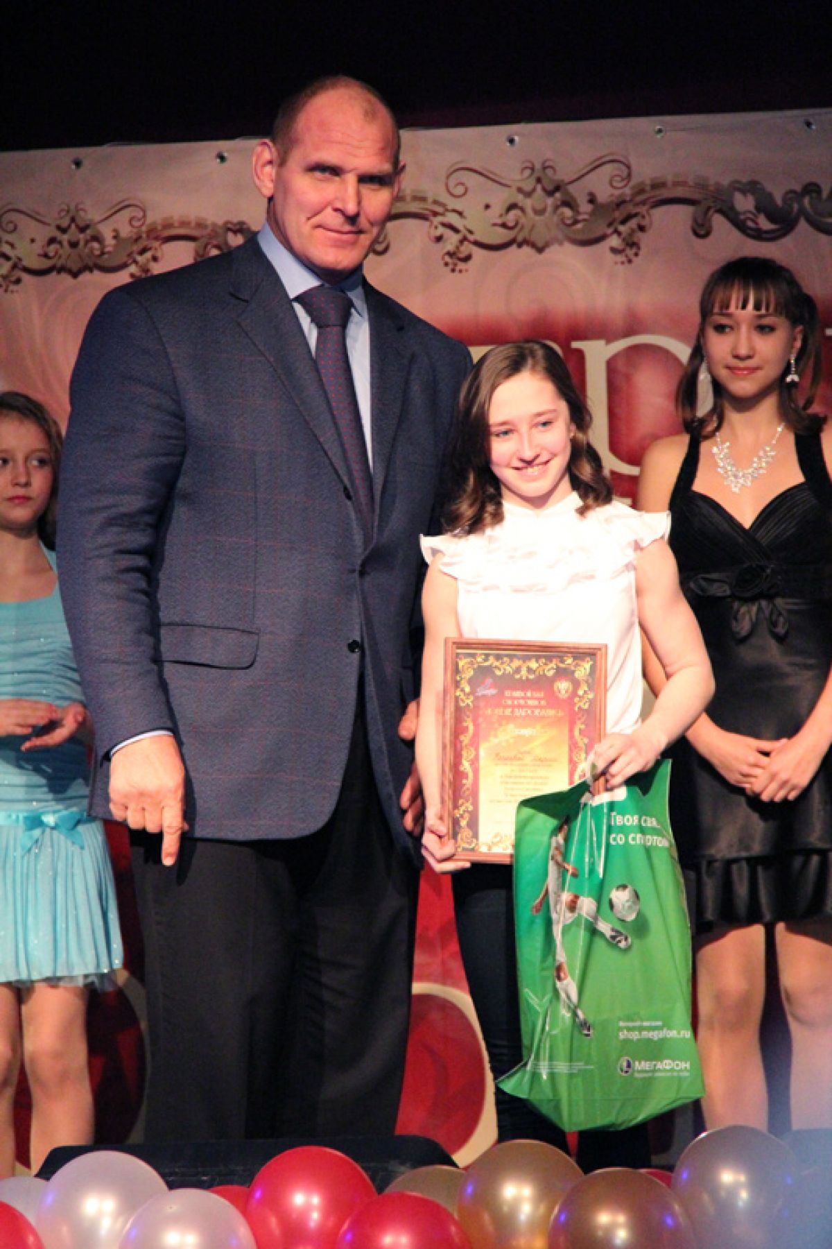 Александр Карелин вручил награды десяти лучшим юным спортсменам Алтайского края по итогам 2012 года. Однако не все они смогли в этот день присутствовать на балу. Так, футболист из СДЮШОР Алексея Смертина Артём Карпукас проходит стажировку в московском «Локомотиве», а боксёр Ибрагим Фeреев из Новоегорьевки так и вовсе во время церемонии находился… на ринге! Причём в Минусинске у Ибрагима был не рядовой бой, а финал первенства Сибири, который алтайский боксёр выиграл. Призы за всех отсутствующих получили родители спортсменов.
