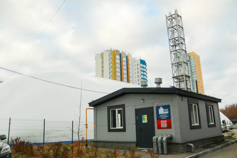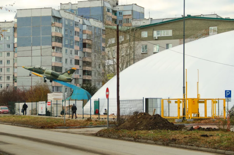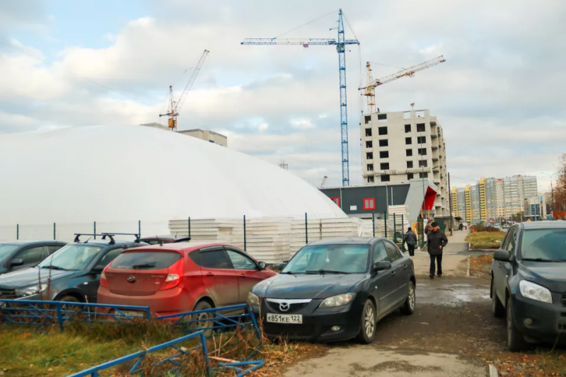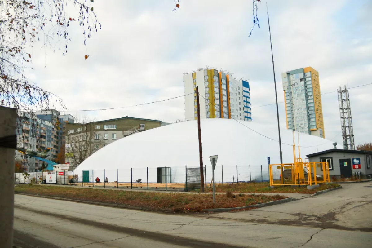 Белый «дирижабль» будто завис среди высоток Индустриального района на углу улиц Шумакова и Взлетной. В ноябре этого года здесь начнут тренироваться детские и взрослые футбольные команды