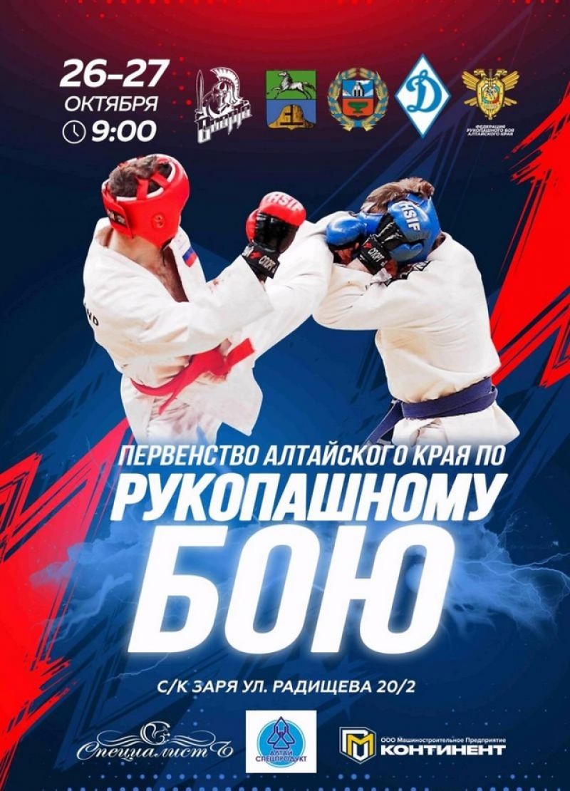 26−27 октября 2024 года в спортивном комплексе «Заря» города. Бийска прошло первенство Алтайского края по рукопашному бою среди юношей и девушек прошло 26−27 октября в спортивном комплексе «Заря». В соревнованиях приняли участие более 150 спортсменов в возрасте от 12 до 15 лет из восьми спортивных клубов, представляющих Барнаул, Бийск, Павловск, а также Зональный и Советский районы.